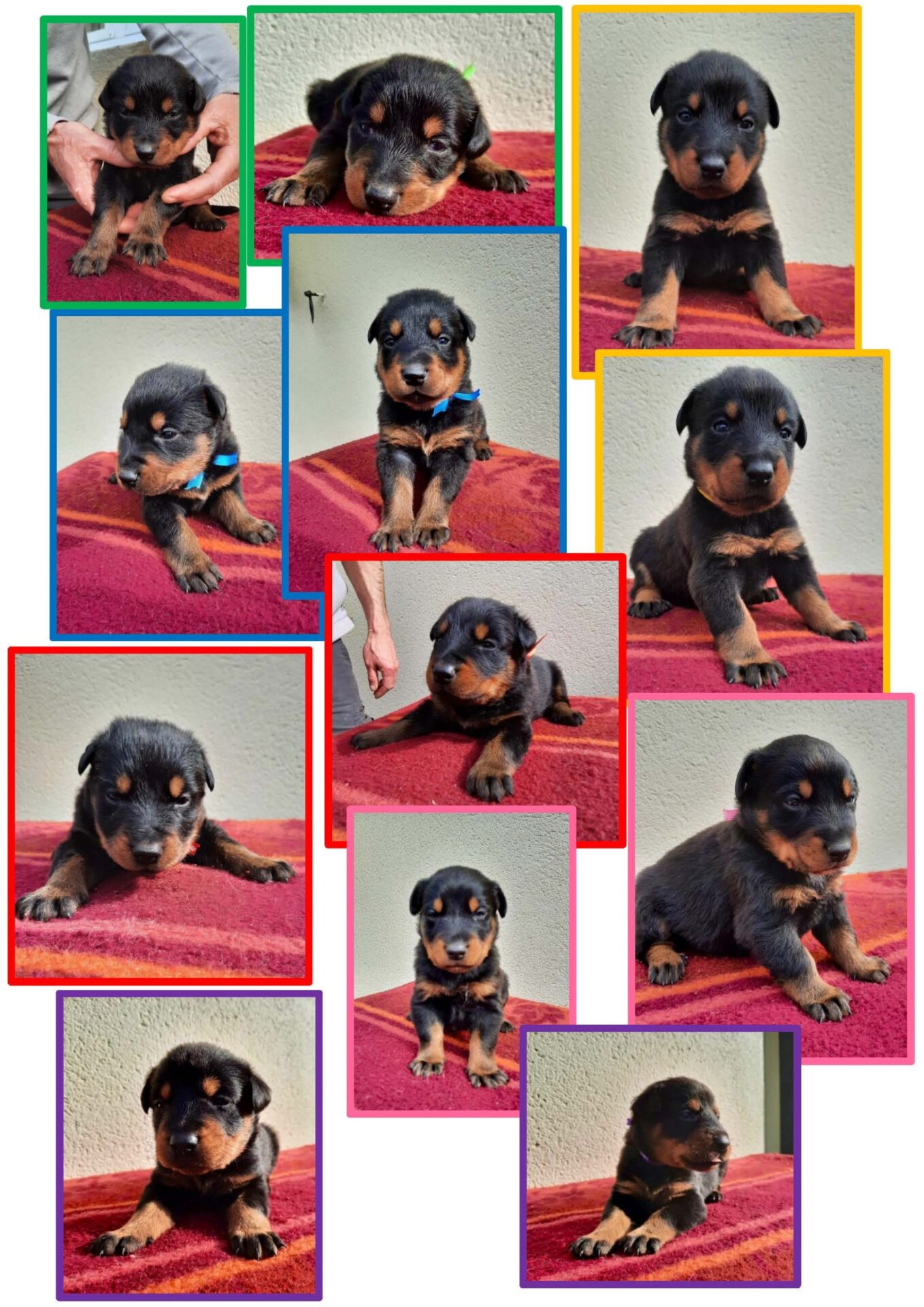 Je vous présente ma portée de six Bergers de Beauce noir et feu issue de l'accouplement entre Neige du Royaume de Galadriel et l'étalon Rogue du Grand Buech, tous deux inscrits au LOF et d'un tempérament très équilibré.