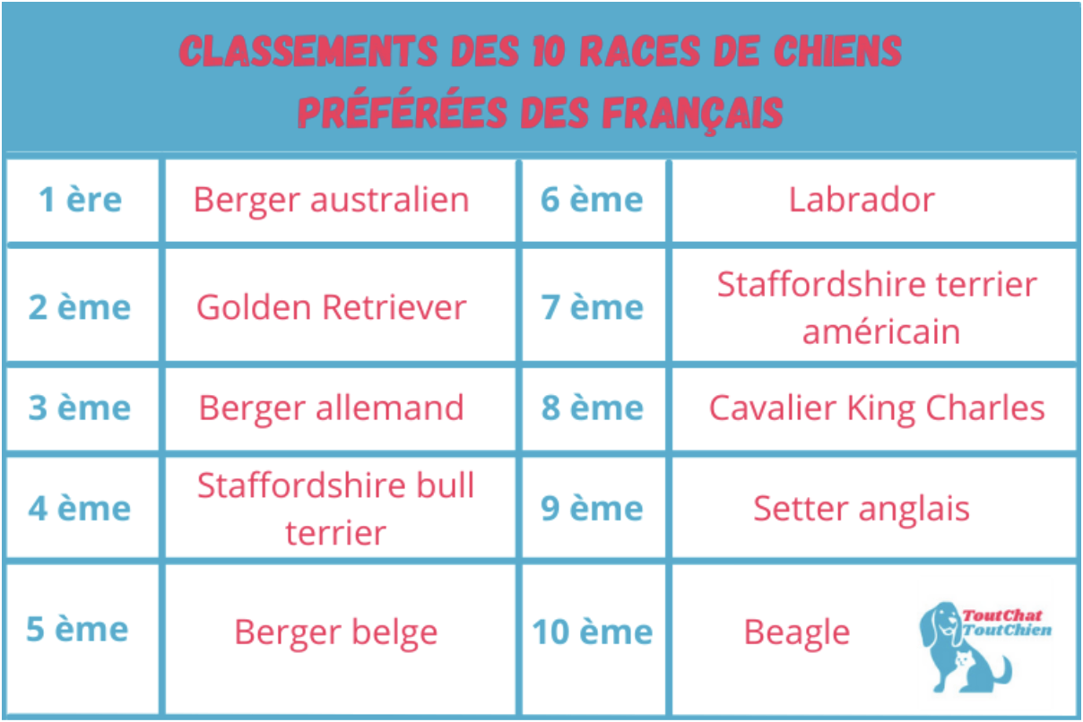 Sans surprise, le Berger australien fait encore partie du top 3 des races de chiens préférées des français. Suivi de près du Golden Retriever ainsi que du Berger Allemand. Ces 3 races de chiens sont idéal pour les familles car ce sont des chiens qui débordent d’énergie. En effet, ils sont très joueurs et patients avec les enfants.